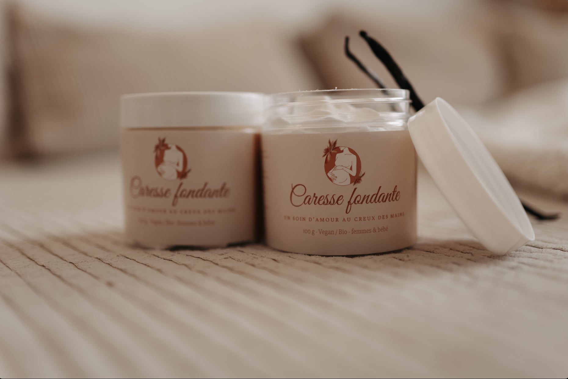 Caresse Fondante est un baume corps 98 % naturel, bio et vegan, imaginé pour la peau des mamans, des bébés et de toutes celles en quête de douceur.